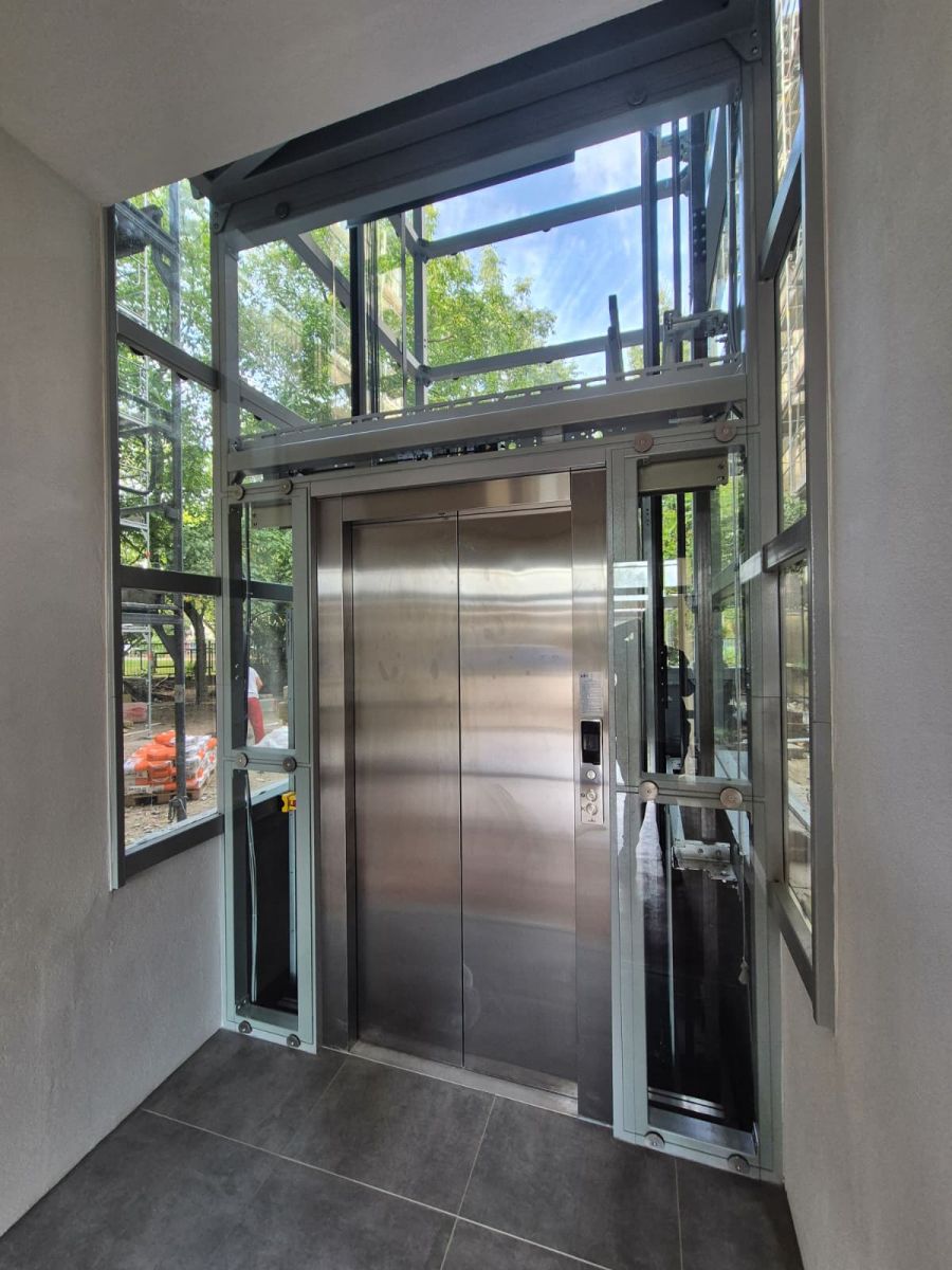Výtah LC Maxi je zhotoven v designové řadě LC Classic s nosností 1050 kg. Je umístěn v moderní celoprosklenné ocelové šachtě, která působí velmi elegantně a přirozeně zapadá do architektury objektu. Konstrukce byla dodána a realizována externí firmou Nolwation.