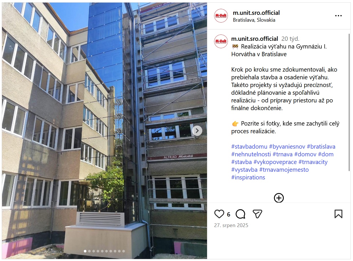 Celý proces realizace byl navíc pečlivě zdokumentován na instagramovém profilu školy, kde je možné sledovat jednotlivé fáze výstavby – od výkopových prací pro prohlubeň výtahu, přes montáž ocelové šachty, až po samotnou instalaci výtahu: