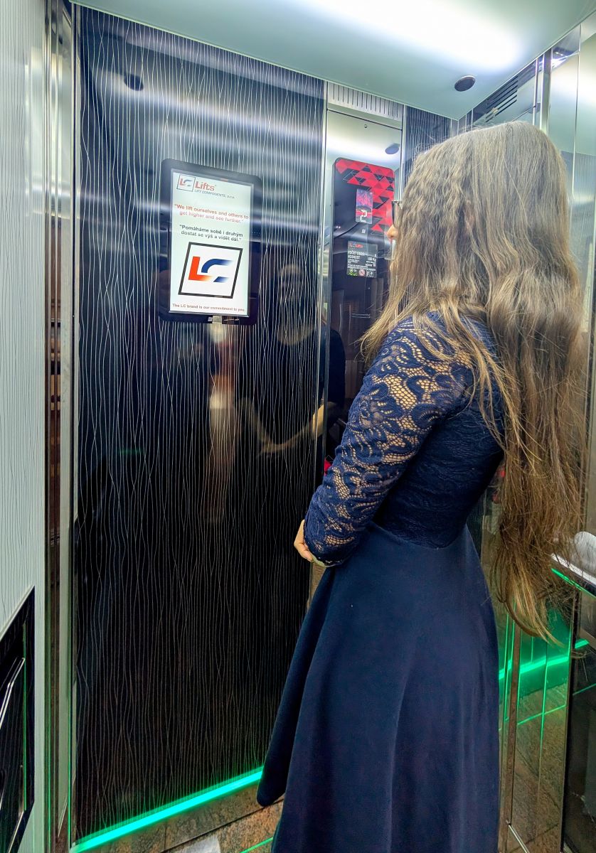 Výtah je místo, kde se lidé dívají kolem sebe – informace tak mají maximální pozornost bez rušení a bez nutnosti cokoli hledat.